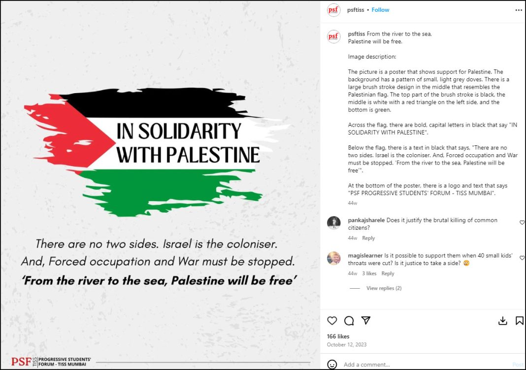 OpIndia went through the history of PSF on social media and found the organisation has consistently supported the “Palestinian cause” and posted anti-Israel content. In one of the posts, they used the highly objectionable and controversial slogan “From the river to the sea, Palestine will be free” which talks about eradicating Israel from the map. The post came just five days after the brutal terrorist attack on Israel by Hamas that killed 1,300 Israelis and foreigners.