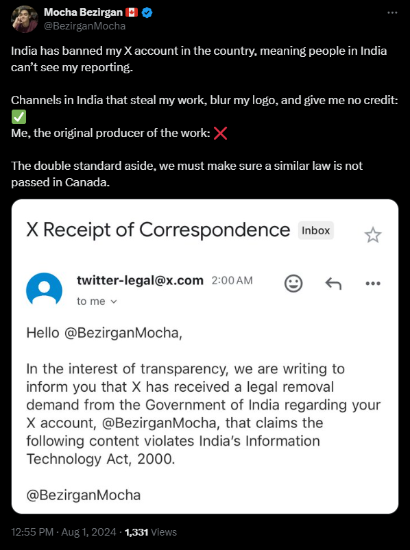 On the 1st of August 2024, the X accounts of two independent journalists, ‘OnTheNewsBeat’ and ‘BezirganMocha’ got withheld in India “in response to a legal demand”. Both these journalists almost exclusively tweeted about the Khalistani nexus. However, later in the day, access to the accounts was restored in India by ?.
