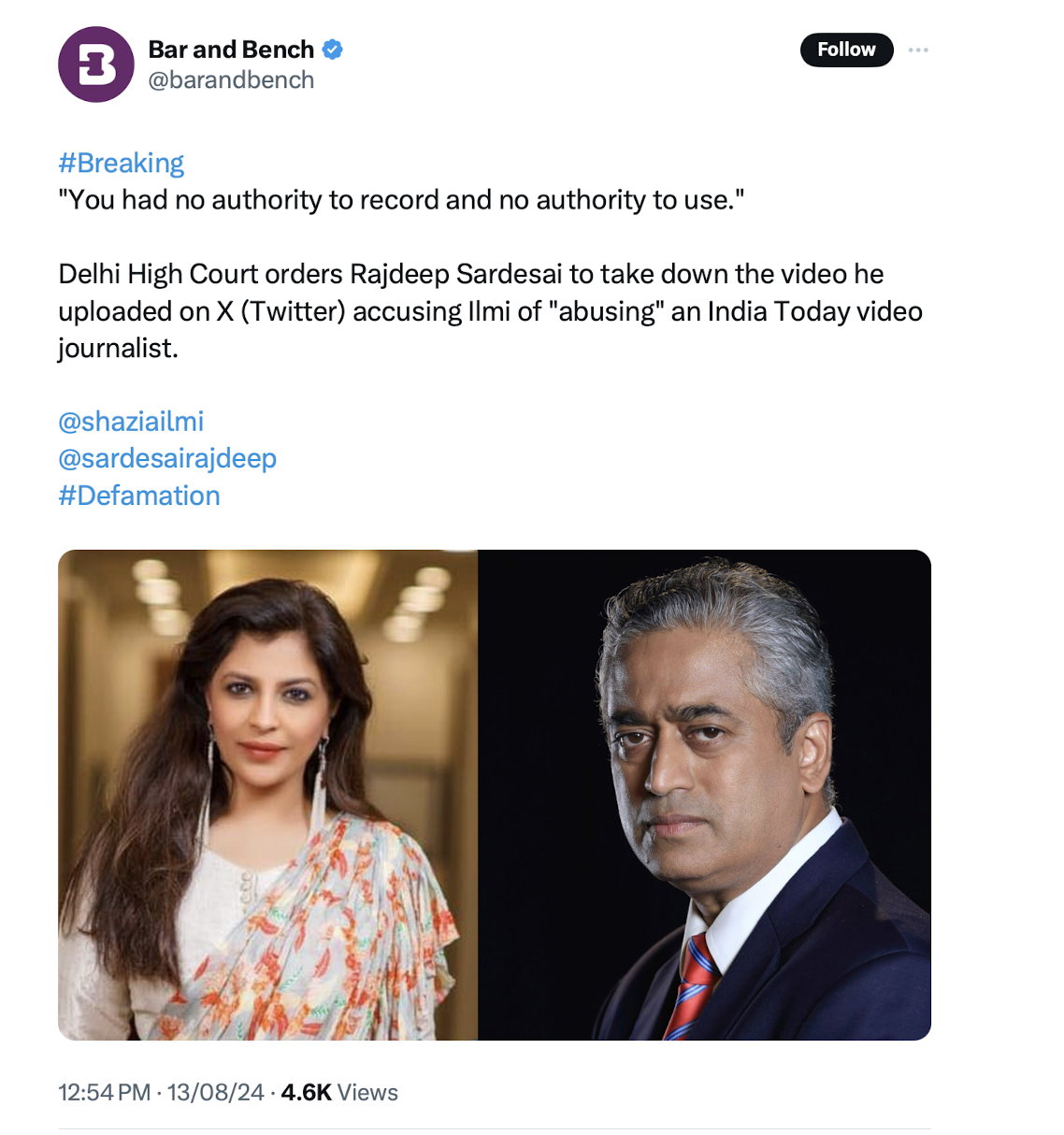 The Delhi HC on Tuesday came down hard on India Today journalist Rajdeep Sardesai, asking him to pull down the video featuring BJP leader Shazia Ilmi, accusing her of abusing an India Today video journalist.