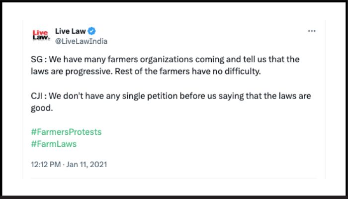 During the hearing of this matter, several observations were made by the Supreme Court bench led by the then CJI N.V. Ramana. The then CJI told the Solicitor General that they had not received any petition saying that the three farm laws were good. The CJI said this when the Solicitor General informed the court that several farmer organisations told the government that they had no difficulty and found the three farm laws progressive.