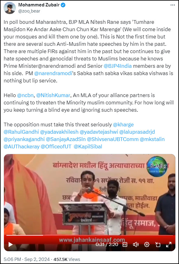 In a post on X, Zubair wrote, “In poll-bound Maharashtra, BJP MLA Nitesh Rane says ‘Tumhare Masjidon Ke Andar Aake Chun Chun Kar Marenge’ (We will come inside your mosques and kill them one by one). This is not the first time but there have been several such Anti-Muslim hate speeches by him in the past. There have been multiple FIRs against him in the past but he continues to give hate speeches and genocidal threats to Muslims because he knows Prime Minister@narendramodi and Senior BJP members are by his side. PM Narendra Modis Sabka sath sabka vikas sabka vishwas is nothing but lip service.”
