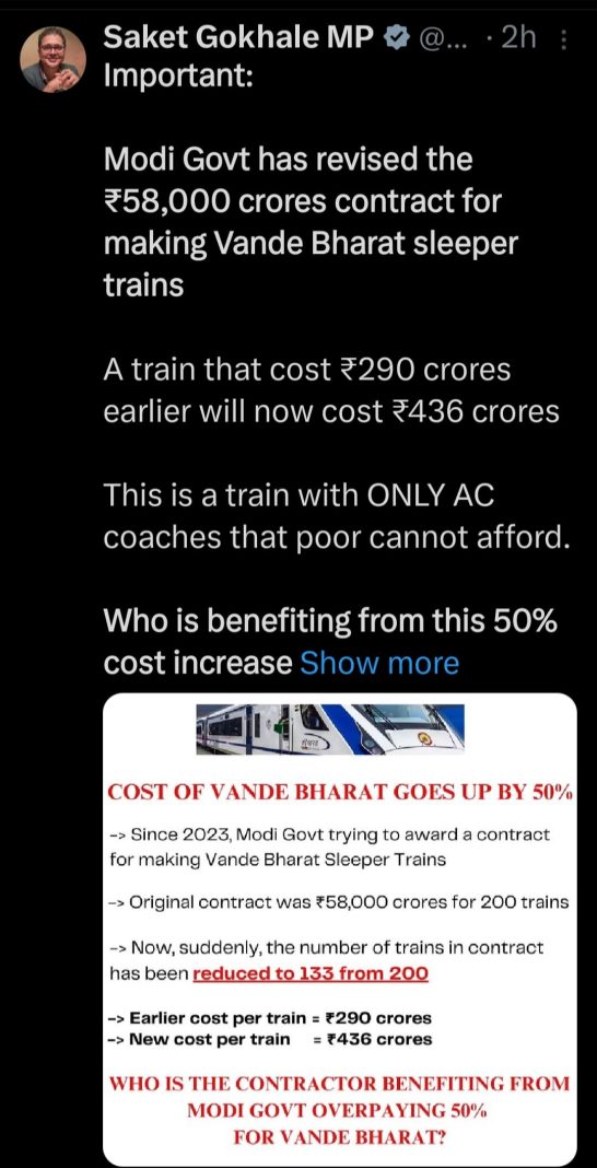 “Modi Govt has revised the ₹58,000 crores contract for making Vande Bharat sleeper trains. A train that cost ₹290 crores earlier will now cost ₹436 crores. This is a train with ONLY AC coaches that (the) poor cannot afford,” Gokhale claimed.