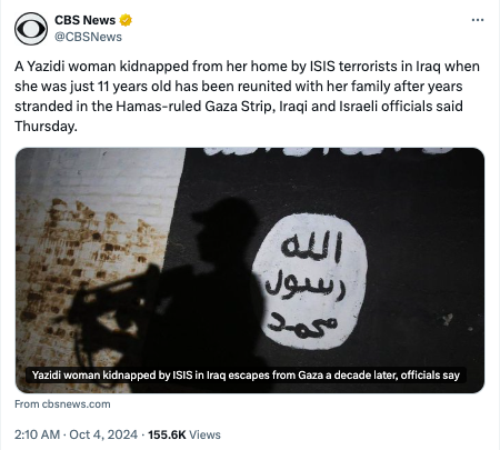 The CBS News article and relevant X post suggested that the Yazidi woman was ‘stranded’ in Gaza, even though she was trafficked from Iraq into Gaza by ISIS terrorists and held in captivity by Hamas terrorists there, forcefully married and turned into a sex slave of the Islamic terrorist.