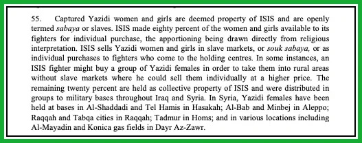 Notably, among the most harrowing part of the ISIS onslaught against Yazidis was that the ISIS jihadis enslaved Yazidi women and girls. ISIS blatantly justified the enslavement and sexual torture of Yazidi women citing Islamic beliefs. ISIS says that Yazidis are Mushriks or polytheists and Islam does not tolerate polytheists, thus their enslavement and abuse is permitted. It is pertinent to mention that Islam has a concept of “Maal-e-Ghanimat”, in this, the Ghanima implies “spoils of war” which may include land, wealth, cattle, women and children. ISIS captured almost 6,000 Yazidi women and girls whom they called Sabaya [slaves] and subjected them to brutal sexual assault, with many being sold in slave markets or “Souk Sabaya” as “war booty” or offered as ‘rewards’ to ISIS terrorists. The Yazidi women were sold multiple times.