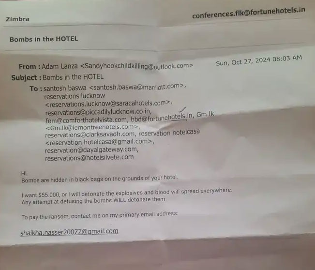On Saturday, 27 October, at around 12:45 PM, at least 10 major hotels in Lucknow, Uttar Pradesh, received bomb threats via email. The sender threatened to blow up the premium properties if a ransom demand of USD 55,000 (approx. Rs 46,24,288) was not met. The hotels that received bomb threats include Marriott, Saraca, Piccadily, Comfort Vista, Fortune, Lemon Tree, Clark Awadh, Casa, Dayal Gateway, and Silvette.