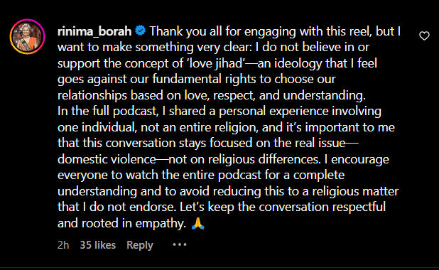 Rinima Borah further alleged, “In the full podcast, I shared a personal experience involving one individual, not an entire religion, and it’s important to me that this conversation stays focused on the real issue—domestic violence—not on religious differences.”
