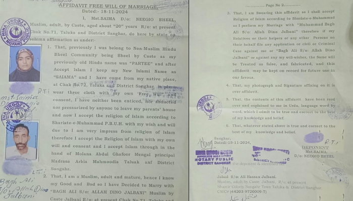“I have neither been enticed, nor abducted nor pressurised by anyone to leave my parents’ house and now I accept the religion of Islam according to Shariat-e-Muhammad P.B.U.H. with my wish and will due to I am very impress from religion of Islam therefore I accept the Religion of Islam with my own will and consent and I accept Islam through in the hand of Molana Abdul Ghafoor Mengal…” the affidavit claimed.