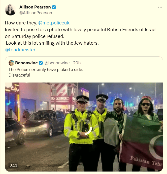 She had tweeted, “How dare they. @metpoliceuk Invited to pose for a photo with lovely peaceful British Friends of Israel on Saturday police refused. Look at this lot smiling with the Jew haters.“