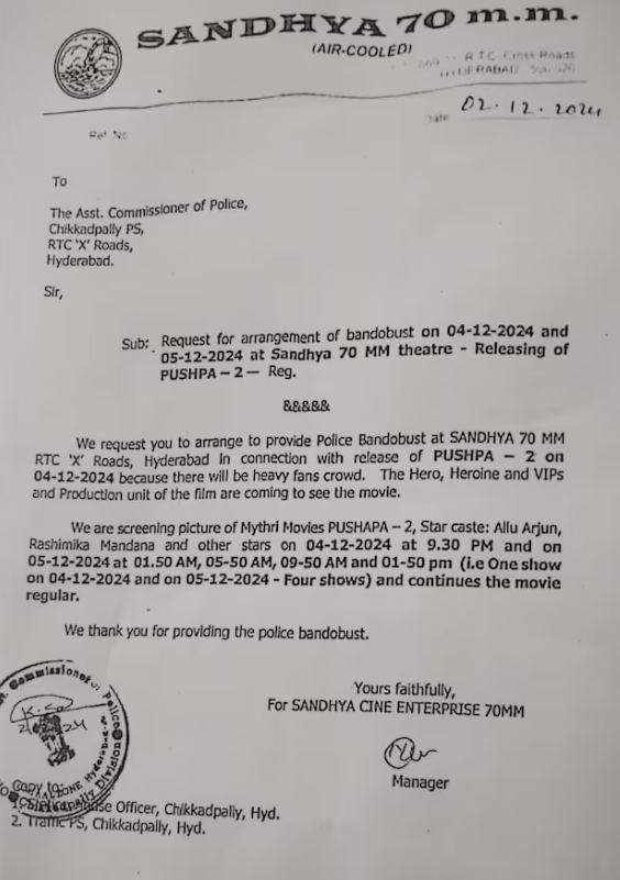 Letter emerges showing Sandhya theatre seeking police bandobast on 4th Dec citing clearly that the movie starcast will be present for the film screening, which could lead to heavy crowding – letter has the stamp & signature of the… https://t.co/wmIqKakmsE pic.twitter.com/QvShG7gqo2