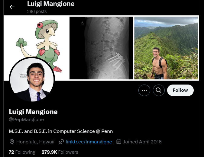 He recently reposted about American neuroscientist Andrew Huberman’s podcast episode about anxiety and depression as well as author Jonathan Haidt’s latest book, “The Anxious Generation.” Another repost complained about the void created by religion’s decrease in the West and the rise of progressive ideas like diversity, equity and inclusion in its stead. An X-ray of a person’s lower back with what looked like screws and plates implanted into it was included in the banner on his profile. Furthermore, additional reviews about health and back pain relief might be found on Mangione’s Goodreads account, such as Crooked: Outwitting the Back Pain Industry and Getting on the Road to Recovery.