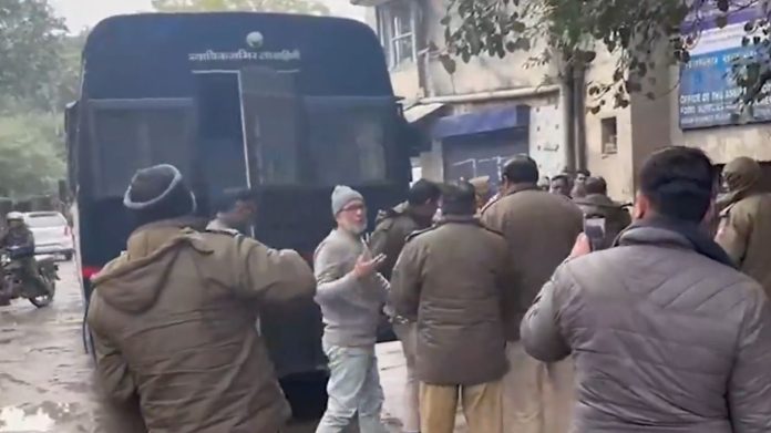 Delhi: Shifa-ur-Rehman, accused in the Delhi riots case and currently imprisoned, was escorted under tight security to file his nomination for the Okhla Assembly constituency as the AIMIM candidate pic.twitter.com/imnPhoyeH0