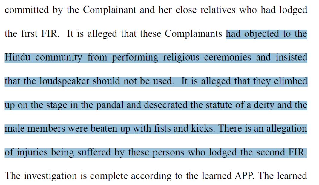 On the other hand, the Hindu family filed a complaint saying that the Muslim family objected to the religious event being conducted at their place. “They (Muslims) had objected to the Hindu community from performing religious ceremonies and insisted that the loudspeaker should not be used. It is alleged that they climbed up on the stage in the pandal and desecrated the statute of a deity and the male members were beaten up with fists and kicks. There is an allegation of injuries being suffered by these persons who lodged the second FIR (Hindus),” the Court was informed.