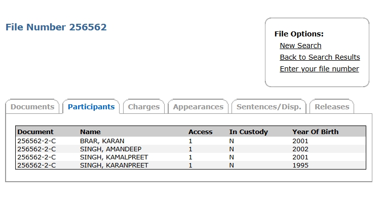 The court record shows that for all four, the ‘In custody’ field is marked as ‘N’, which means they are not in custody.