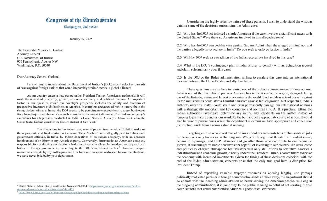 Pointing at the selective nature of the US Justice Department’s action against Gautam Adani and his companies, the Republican leader said, “Why has the Department of Justice not indicted a single American if the case involves a significant nexus with the U.S.? Were there no Americans involved in this alleged scheme? Why has the Department of Justice pursued this case against Gautam Adani when the alleged criminal act, and the parties allegedly involved are in India? Do you seek to enforce justice in India?”