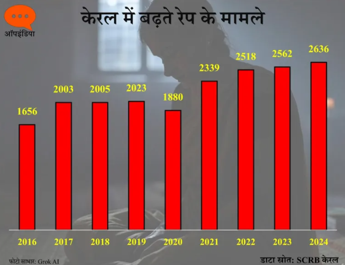 Notably, the safety of women in the state of Kerala is also being questioned as the incidents of rape against women in the period between 2016 and 2024 have risen by 62%. The number of cases has increased from 1656 to 2636. Cases of assault from the Malayalam film industry have also emerged with recent reports exposing widespread sexual exploitation of women at the hands of directors, actors, and producers.