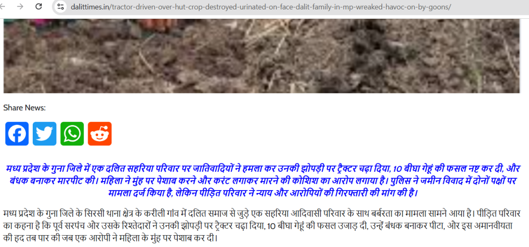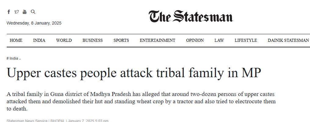 Another similar report filed by the Statesman reported that the ‘upper caste’ people attacked the tribal family in Madhya Pradesh. However, the attack was not out of caste hatred but due to a long-standing land dispute between the two families. The OBC Jankalyan Sangh also suspects that the victim’s family is making partially false allegations against the accused persons by claiming that the latter urinated on them and tried to electrocute them to death.