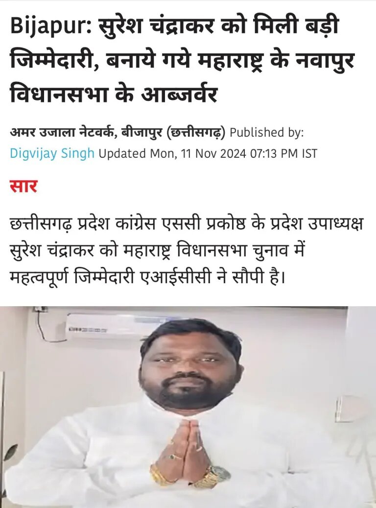 The Congress party contended that Suresh, had left the party to join the BJP, in light of the controversy. Nevertheless, a report from Amar Ujala, dated 11th November 2024, which he posted on his Facebook page, challenged this claim. It revealed that Suresh Chandrakar, serving as the State Vice President of the Chhattisgarh Pradesh Congress SC (Schedule Caste) Cell, was appointed as the observer for the Navapur assembly constituency during the Maharashtra assembly election.