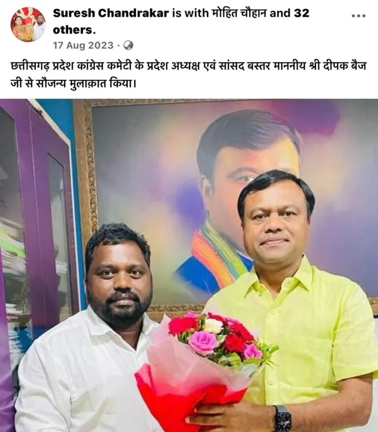Suresh Chandrakar proudly shared his courtesy meeting with Deepak Baij, the head of the Chhattisgarh Pradesh Congress Committee, in another post.