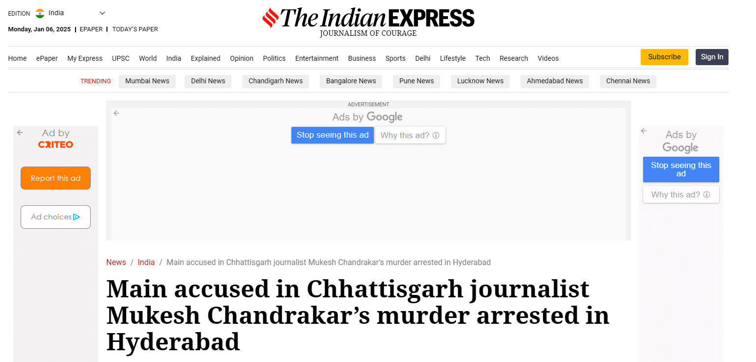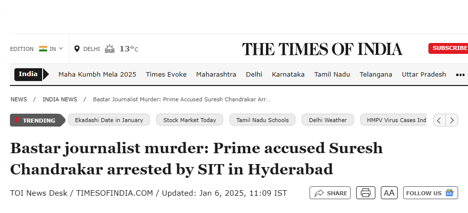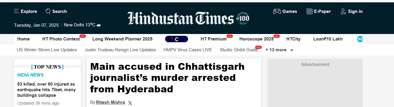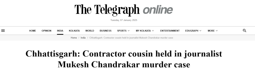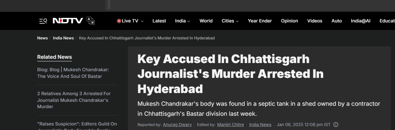 28-year-old journalist Mukesh Chandrakar, who ran a YouTube channel called Bastar Junction in Chhattisgarh, had been missing since 1st January. Notably, his investigative work had revealed financial discrepancies amounting to Rs 120 crore in a road project within the Bastar region, an area known for its Maoist insurgency, which led to the initiation of a government inquiry.