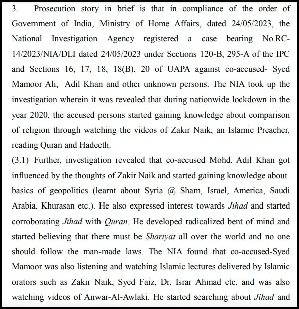 The NIA found that during the nationwide lockdown in the year 2020 in the wake of Covid pandemic, the accused persons Syed Mamoor Ali, Adil Khan and others started learning about comparison of religion through watching the videos of Zakir Naik, an Islamic hate preacher, reading Quran and Hadees. Accused Jihadi Adil Khan was influenced by fugitive Zakir Naik’s jihadist rhetoric to a great extent and gained knowledge about the geopolitical landscape pertaining to countries like Syria, particularly Sham, Israel, United States, Saud Arabia and Khurasan among others. The accused drew a Quranic significance to Jihad and became convinced that Shariyat or the rule of Sharia must be imposed all over the world and people should not follow man-made laws.