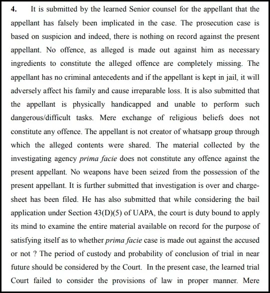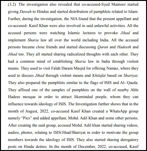 The bench listed the accusations made against Mohammad Shahid Khan based on the perusal of the NIA chargesheet. The court said that Shahid Khan was associated with ISIS alongside other accused persons and was in possession of incriminating materials related to Jihad and ISIS. The court noted that Shahid Khan alongside the co-accused persons was planning on disseminating the jihadist ideology of ISIS through Dawah programs and was involved in radicalising those who came into their contact to recruit them into ISIS eventually.