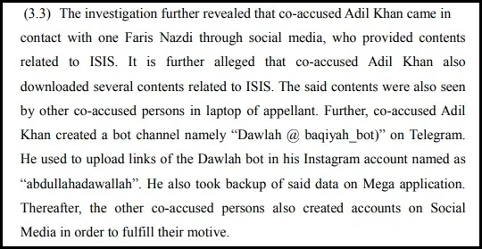 “In order to escape themselves from the radar of Investigation Agency, they decided to use code names for ISIS such as “eye S”, “eye ass”, “eye as”, “eye sis”, “eye see”, “Dhadiwale”, “Dawlah”, “1515”, “15”, “Mujahideen” and “Eye s fisabilillah”. They also decided that present appellant would be the Ameer of the group,” the court order reads.