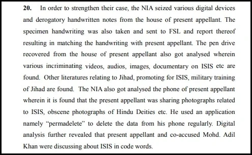 The Madhya Pradesh High Court further noted that NIA seized digital devices including a pen drive and derogatory handwritten notes belonging to the present appellant Mohammad Shahid Khan. Through forensic examination, it was confirmed that the notes were indeed written by the accused Shahid. Upon analysing the seized pen drive, the NIA found inflammatory videos, audio, images, and documentary on ISIS in addition to materials pertaining to jihad, promoting ISIS, military training for Jihad and so on.
