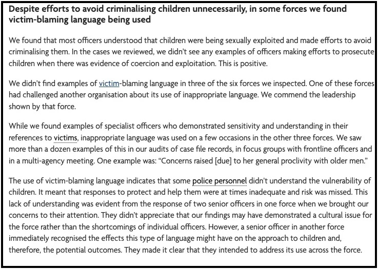 In one incident of police staff victim blaming, the police accused a victim by noting that “concerns [were] raised [due] to her general proclivity with older men”. In another case, a missing child was classified as “medium-risk due to age – streetwise and tends to return the next day”. In another example, a child was referred to as “putting herself in precarious situations,” and another child as a “difficult victim to engage with.”