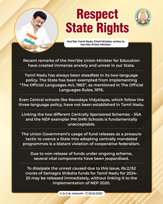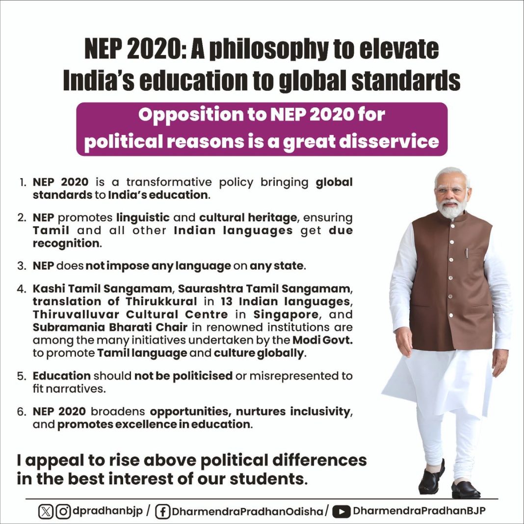 He stated, “This brings me to a crucial point – the three-language policy, which has been the backbone of India’s education framework since 1968. Unfortunately, despite being part of successive education policies, it was never implemented in letter and spirit, leading to a decline in the systematic teaching of Indian languages in schools. Over time, this has resulted in an over-reliance on foreign languages, limiting exposure of students to their linguistic roots. NEP 2020 seeks to correct this historical oversight by ensuring that every Indian language, including Tamil, receives its rightful place in education.”