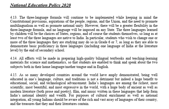 The policy does not require students to take up any one language or languages and instead allows the choice to the states and the learners. The formula underlines that each Indian student must study three languages: a foreign language and two native including one regional. English is automatically selected as a foreign language since it has become popular in India as a result of its colonial past and its subsequent prominence as a global language. Any of the three languages could be used as the medium of instruction and it is for both public and private institutions.