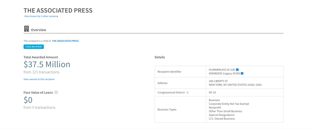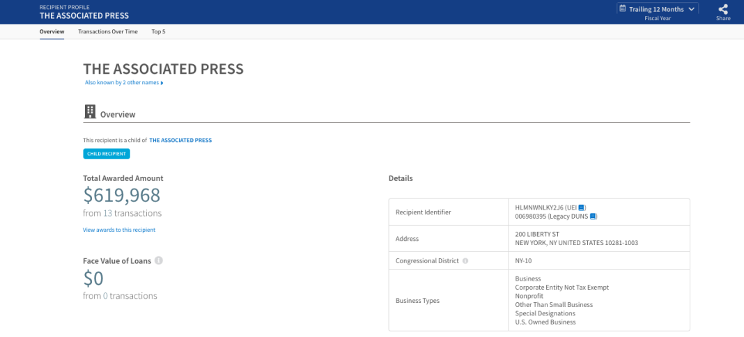 Another ‘independent’ news outlet that received federal funding is The Associated Press. The left leaning news outlet received $619,968 from 13 transactions in the trailing 12 months with the Department of State (DOS) being the top contributor making up to 87.45% of the funds awarded.