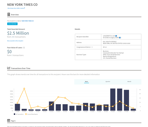 The US Government gave the New York Times tens of millions of dollars over just the past 5 years despite paying relatively little money to the NYT in the years preceding 2021. For instance, in August 2024, the US government awarded $4.1 million to the NYT.
