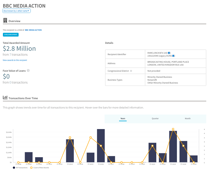 Upon checking official data, OpIndia found that in the trailing 12 months, BBC Media Action received $2.8 million from 7 transactions with USAID being its top awarding agency in the United States followed by the Department of State. Overall, since 2008, BBC Media Action has received $17.3 million from 49 transactions of which the highest were made during the years 2013, 2016, 2021, 2023 and 2024.