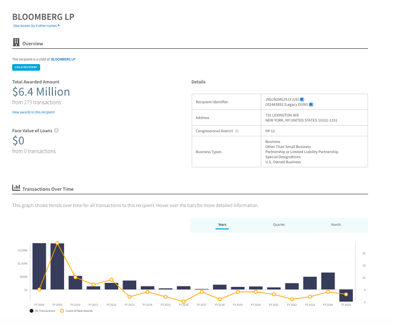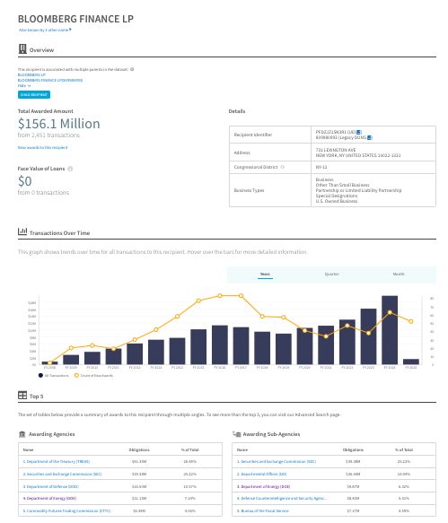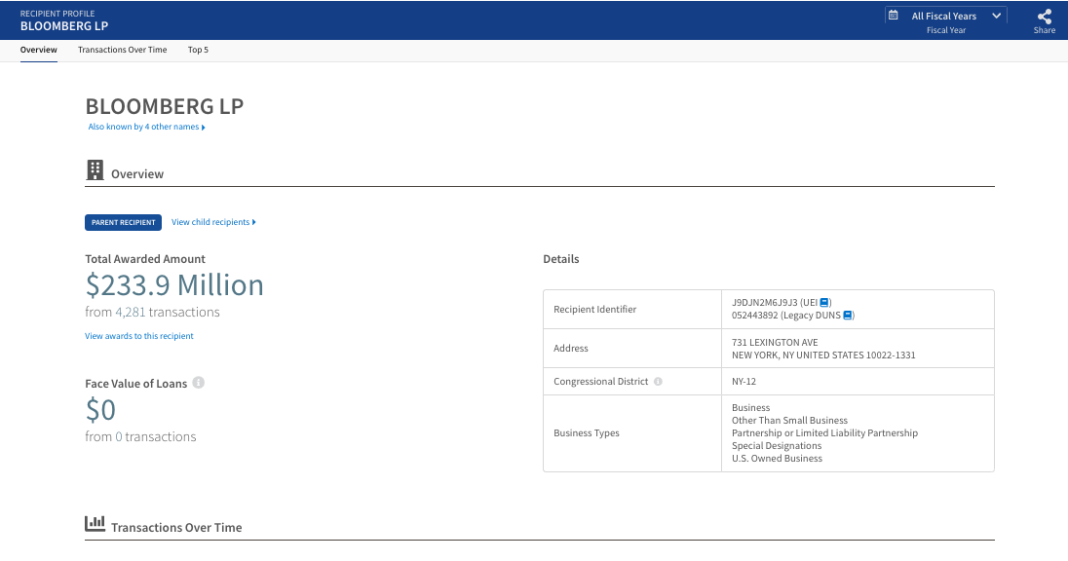 During our search, we came across the recipient profile of Bloomberg LP (parent recipient) and found that the company received $233.9 million from 4,281 transactions since 2008.