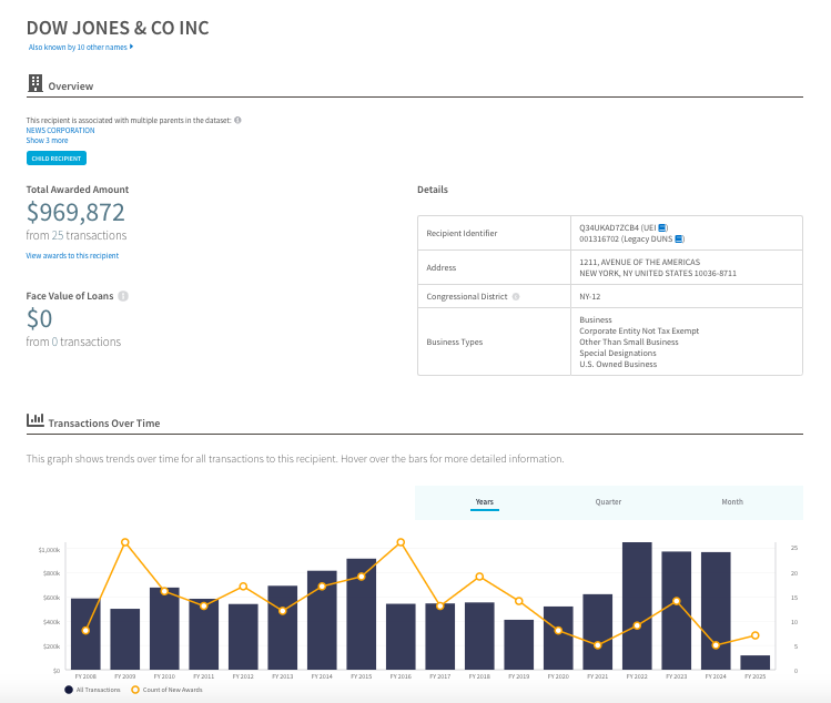 Other than Bloomberg, Dow Jones & Company which owns The Wall Street Journal and is a subsidiary of News Corp is also among the major recipients of the US federal funding. The company has continuously been receiving significant funding since 2008, the highest transactions were recorded in the years 2022, 2023 and 2024. In the trailing 12 months alone, Dow Jones & Company received $969,872 from 25 transactions.