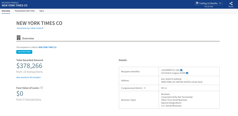 In the trailing 12 months, the media outlet received about $378,266 from 18 transactions. The New York Times received its highest funding under the Biden administration. The Department of Defense with obligations to the tune of $201198 followed by the Treasury Department with obligations of $75,012 were the top contributors to New York Times Co.