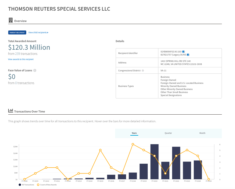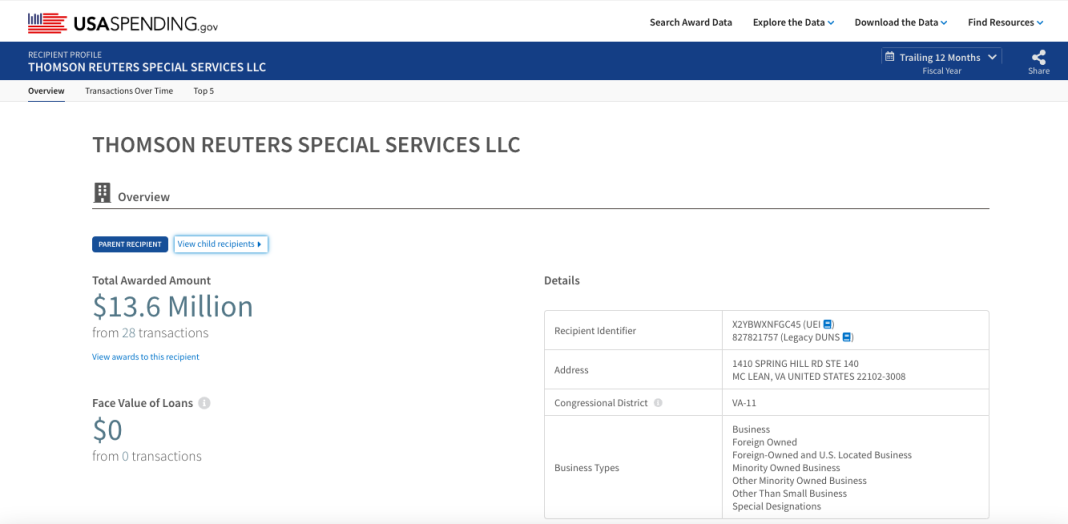Meanwhile, in the trailing 12 months Thomson Reuters Special Services LLC received $13.6 million from 28 transactions.