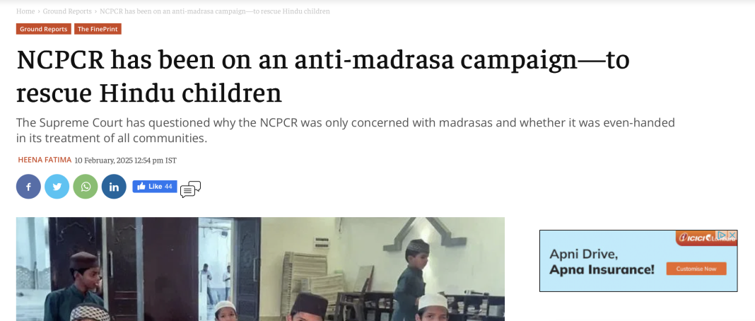 The article titled “NCPCR has been on an anti-madrasa campaign—to rescue Hindu children” targets former NCPCR chief Priyank Kanoongo and the statutory body, characterising their efforts to rescue Hindu children from madrasas as yet another stick to beat Muslims.