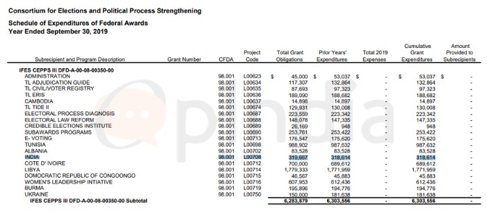 As mentioned above, CEPPS operates via three fronts: the International Foundation for Electoral Systems (IFES), the International Republican Institute (IRI), and the National Democratic Institute (NDI). To make it evident that USAID has had a significant financial influence in Indian elections for years, it should be noted that CEPPS spent $318,614 in India in FY 2018, as clearly stated in its audit report.