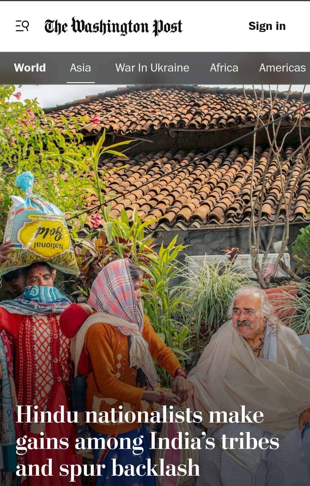 “Even in dense jungles, India’s right-wing Hindu movement is pursuing its project of transforming this historically secular country into a Hindu nation, seeking to convince millions of tribal people who have long remained outside mainstream religion that they, too, are Hindu,” the article published in The Washington Post’ read.