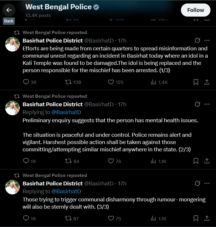 While dubbing the incident as mere ‘mischief, ‘ the police stated, “Efforts are being made from certain quarters to spread misinformation and communal unrest regarding an incident in Basirhat today where an idol in a Kali Temple was found to be damaged.“