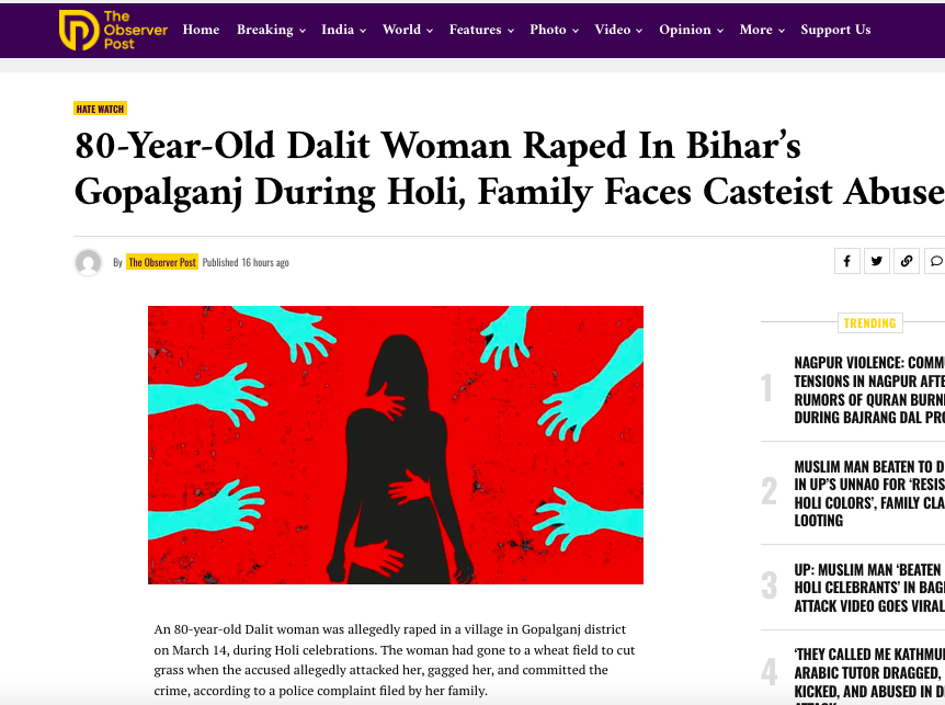 Similarly, The Observer Post, an Islamist ‘media’ outlet notorious for peddling fake news and false narratives, also insinuated that the alleged incident happened during Holi celebrations. Despite mentioning details from the complaint, both the Islamist propaganda outlet and TOI omitted the names of the Muslim accused and laid emphasis on Holi and casteist slurs hurled at the victim by the accused. Thus, keeping the readers the impression that the casteist slurs spoken against the Dalit woman and the alleged crime were committed by Holi-celebrating ‘upper caste’ Hindu men.