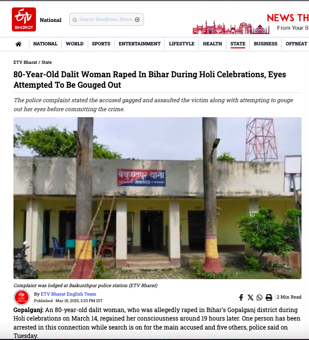 In Bihar’s Gopalganj district, an 80-year-old Dalit Hindu woman was allegedly raped on 14th March 2025 when she had gone to a wheat field to cut grass. According to the complaint lodged by the victim’s son, at around 4:30 pm, the victim was attacked and gagged by a Muslim man who then allegedly raped her. Reports say that the accused also attempted to gouge out her eyes.