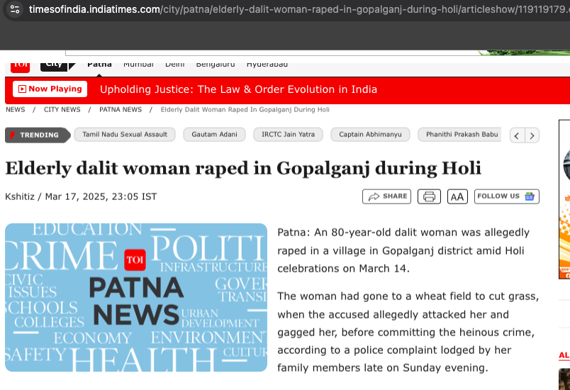 During #Holi, a #Dalit #Hindu woman was gangraped in #Bihar. @TOIIndiaNews promptly mentioned "During Holi" to give an impression that the crowd celebrating Holi i.e. Hindus had done this heinous crime. They do not disclose the name of the criminals, which you should have guessed… pic.twitter.com/WgLtF9rLhP