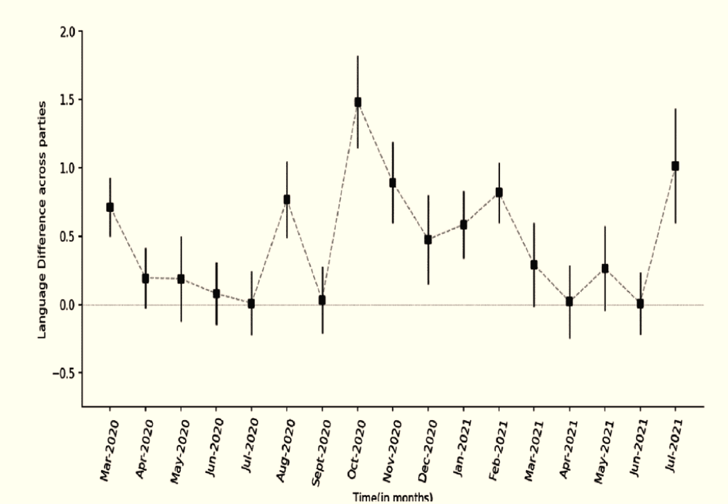 “We can see a U-shaped trend in the language difference between BJP and Congress during February 2021 to August 2021. Interestingly, the vaccination started in India in January 2021 for the health and frontline workers and was subsequently rolled out for the general public in phases since March 2021. During the height of the second wave of COVID-19 in India, polarization had come down but again