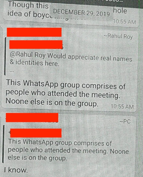 Immediately after this message exchange, on the 12th of March, Rahul Roy removed two people from the group. One was Sachin Rao and the other was Athar Khan.