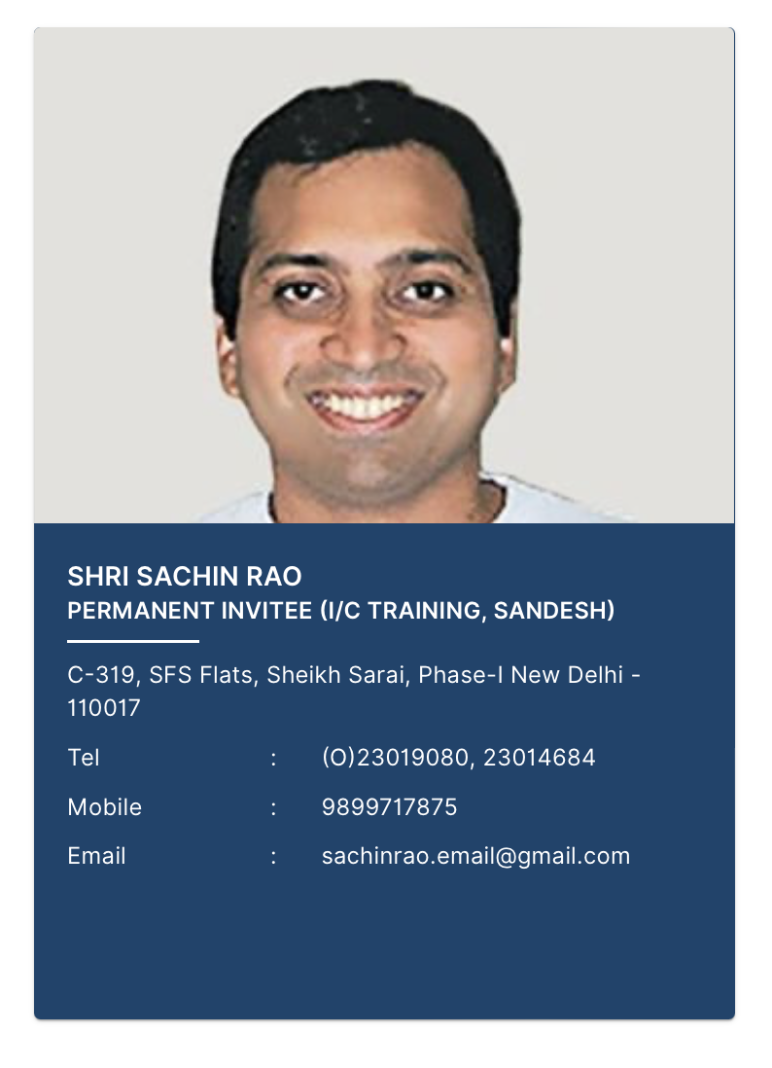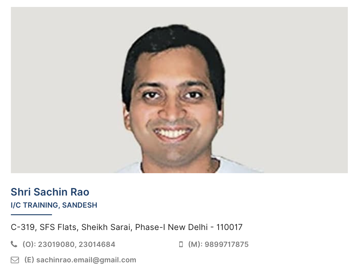 On the AICC officer bearers page, Sachin Rao (listed with the same mobile number), is marked as the in charge of training, Sandesh.