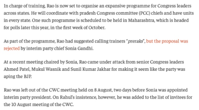 The Statesmen said, “Sachin Rao, who is heading the Congress training cell, has moved out of Rahul Gandhi’s office but his advice is considered important. He has studied in the Michigan Business School”.