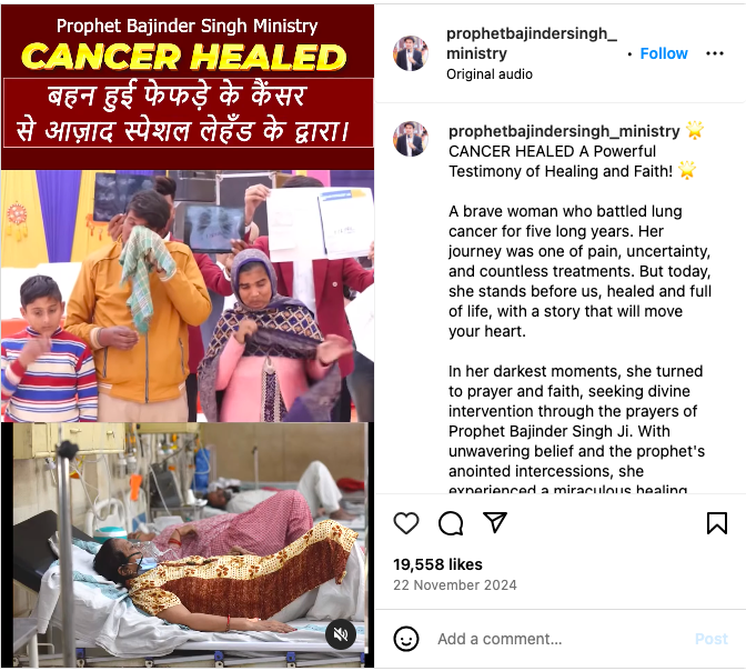 In another Instagram post published in November 2024, Prophet Bajinder Singh claimed to have healed a woman’s lung cancer after Singh performed a ‘special prayer’ for her. Boasting the so-called miraculous healing, Singh wrote, “A brave woman who battled lung cancer for five long years. Her journey was one of pain, uncertainty, and countless treatments. But today, she stands before us, healed and full of life, with a story that will move your heart. In her darkest moments, she turned to prayer and faith, seeking divine intervention through the prayers of Prophet Bajinder Singh Ji. With unwavering belief and the prophet’s anointed intercessions, she experienced a miraculous healing that defied medical expectations.”