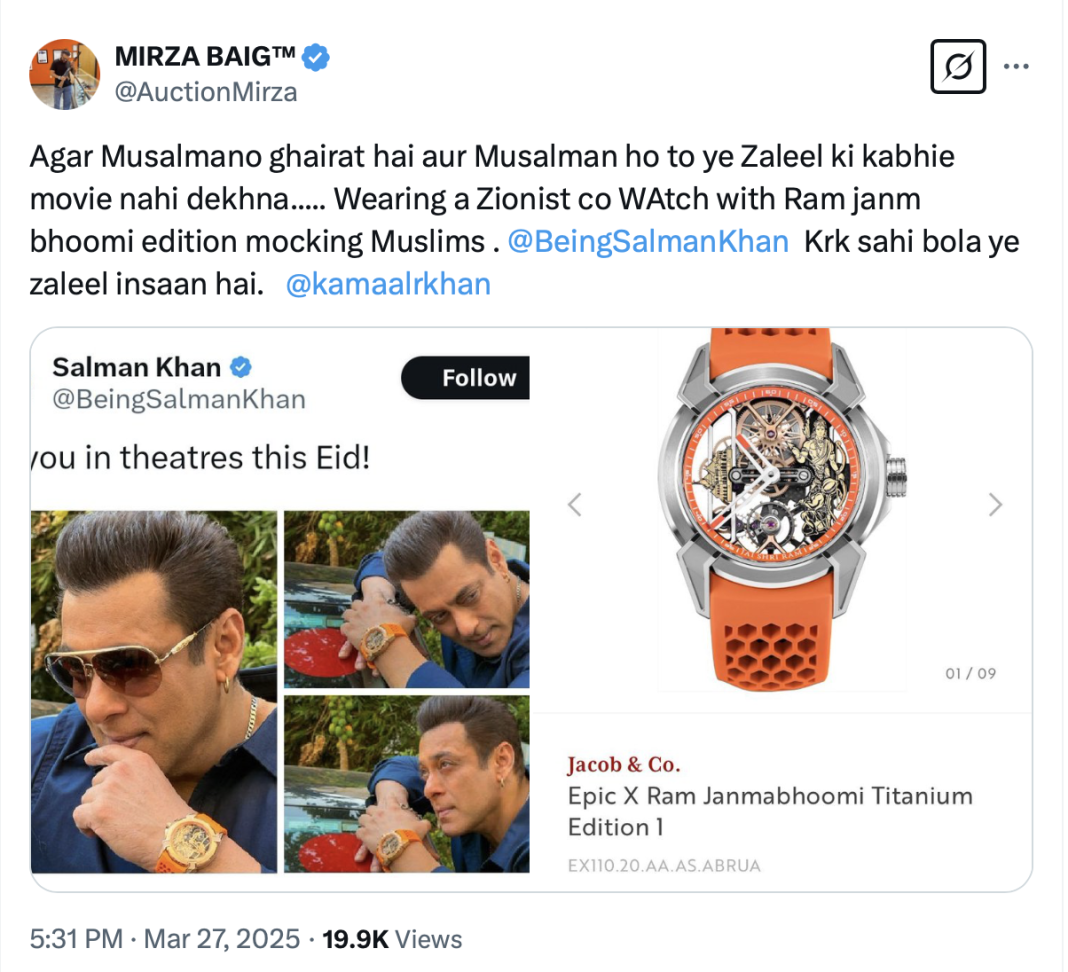 “Wearing a Zionist co Watch with Ram Janm Bhoomi edition mocking Muslims,” tweeted one of the Islamists, triggered by Salman’s pictures.